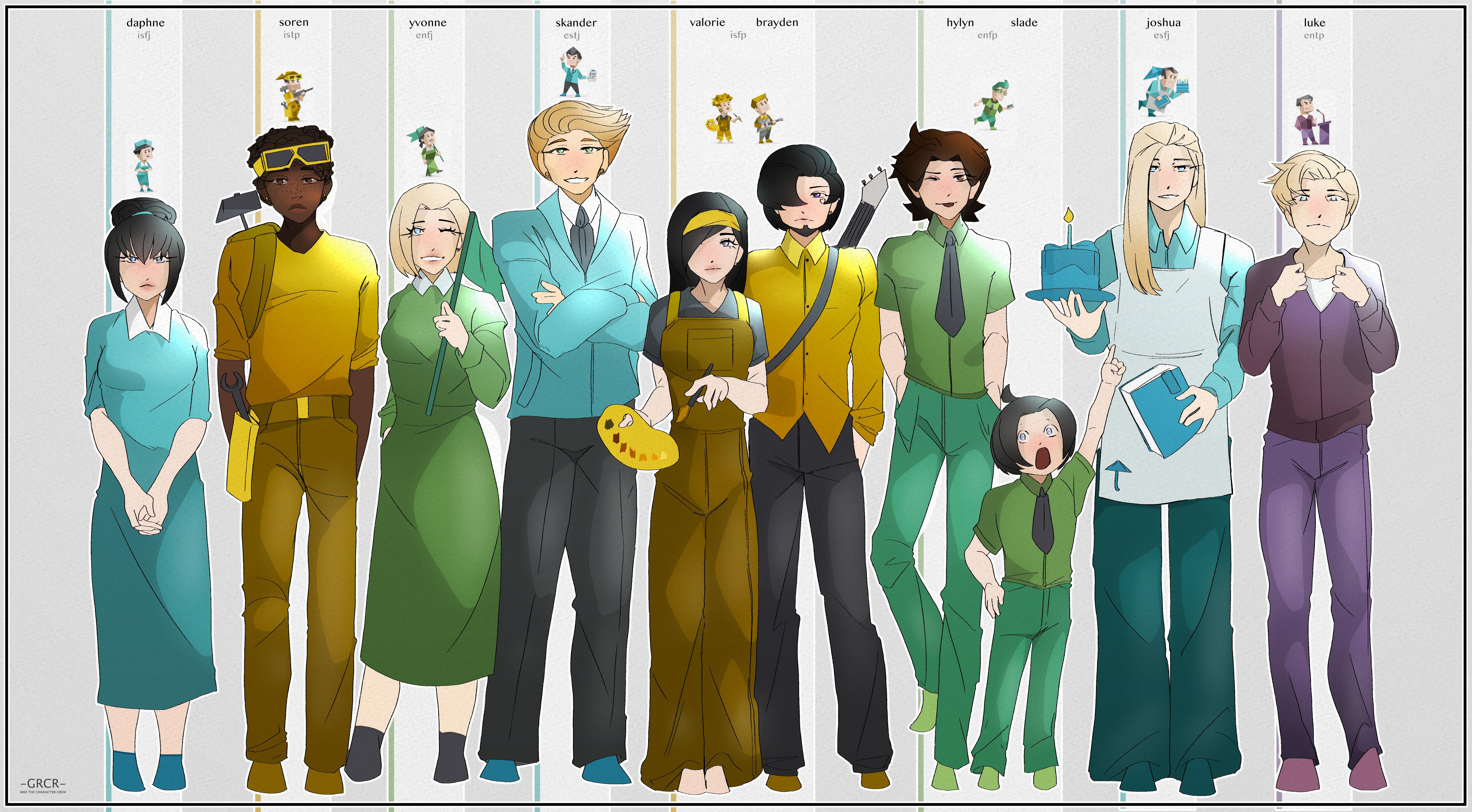 Okay, heehee. A quick lil picture because I was feeling silly. I decided to draw my gang (plus Yvonne’s brothers, Luke and Joshua) dressed as their MBTI type things… lol.