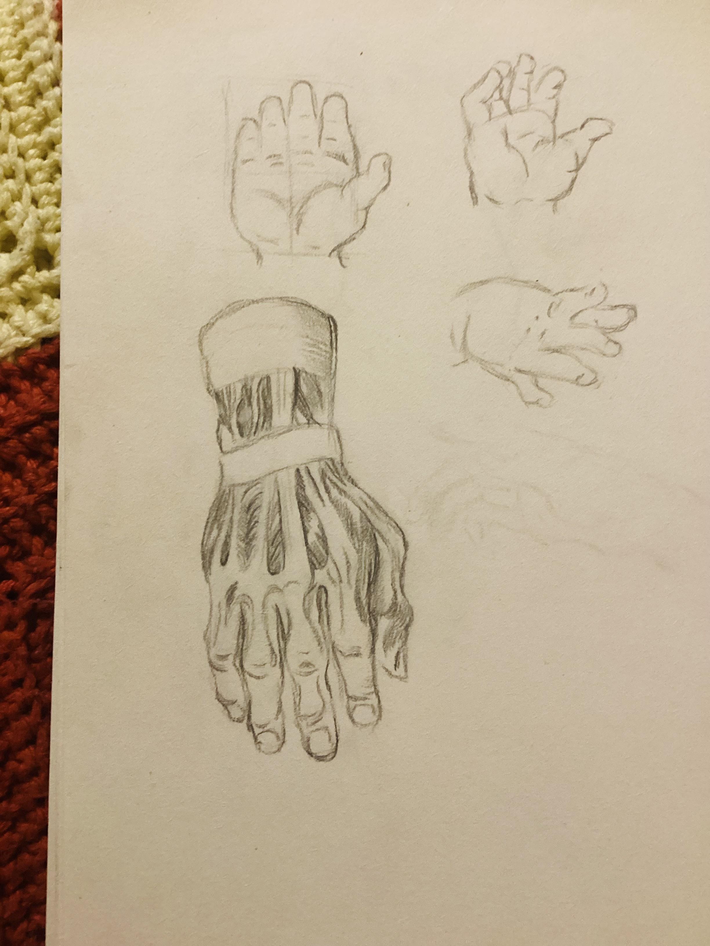 Anyways, here’s something! It got horribly smudged (this type of paper is not for drawing – it’s very textured watercolor paper!) but I was practicing baby hands and drawing a full muscled hand for fun.