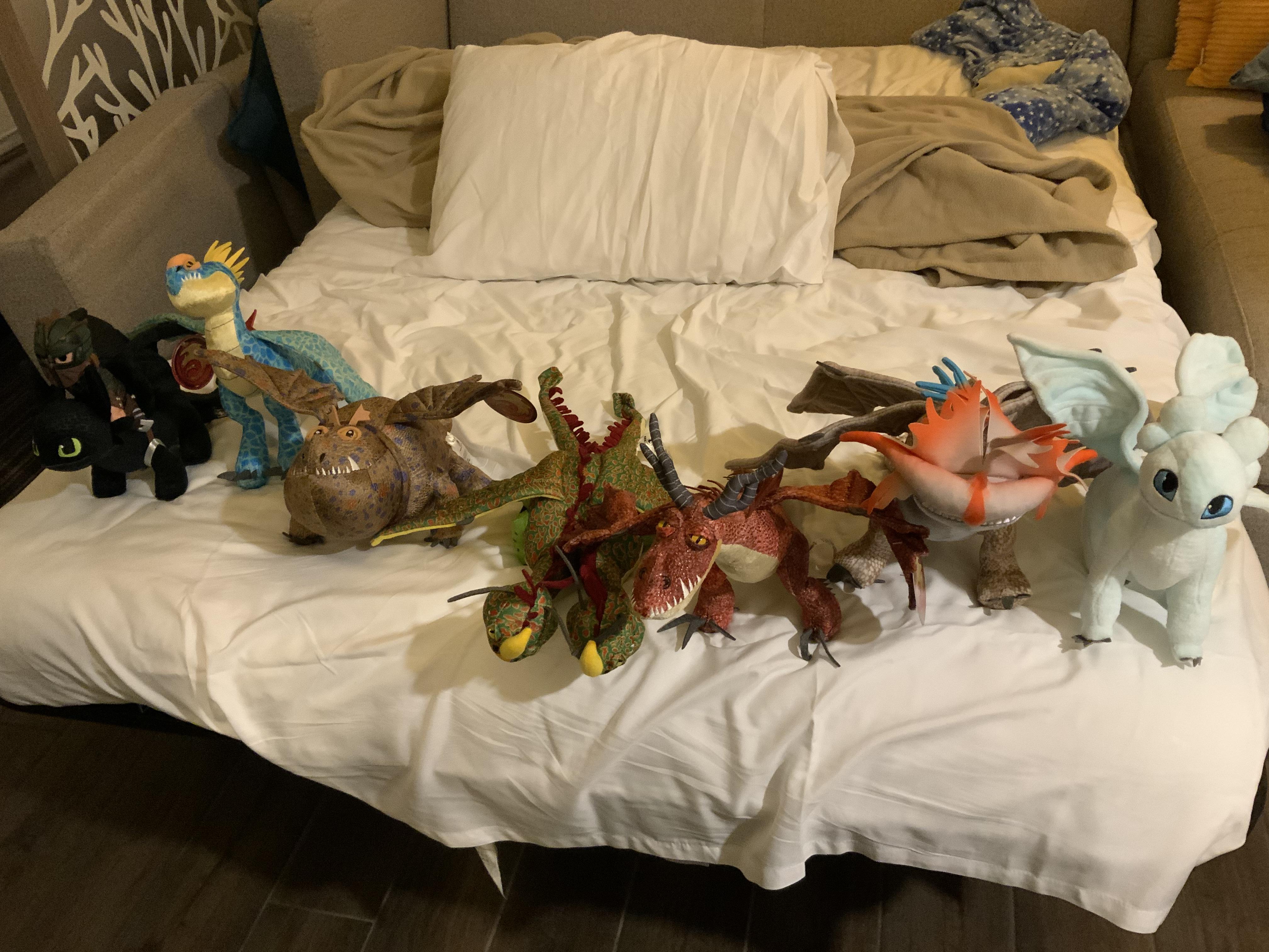 POV: you went to Universal, and bought their ENTIRE LINE of HTTYD plushies.he’s blocked by the blanket but I already had a build-a-bear Toothless, too. (Plus the Light Fury, who I named Brightness ‘cause it rhymes, and their babies, but I left them at home)
